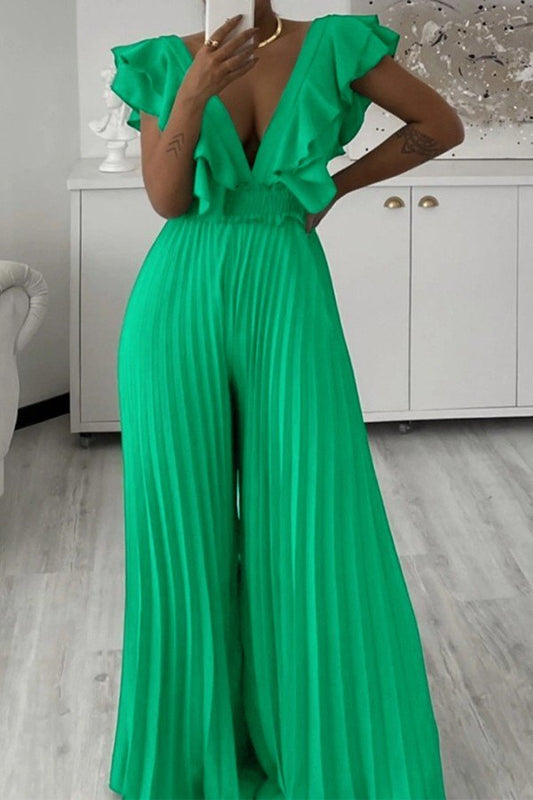 Step out in style with our Deep V-neck, High-Waisted Sexy Peplum Pleated Wide-Leg Jumpsuit. This stunning garment is designed to enhance your silhouette while providing ultimate comfort. Here?????s why you?????ll love it: