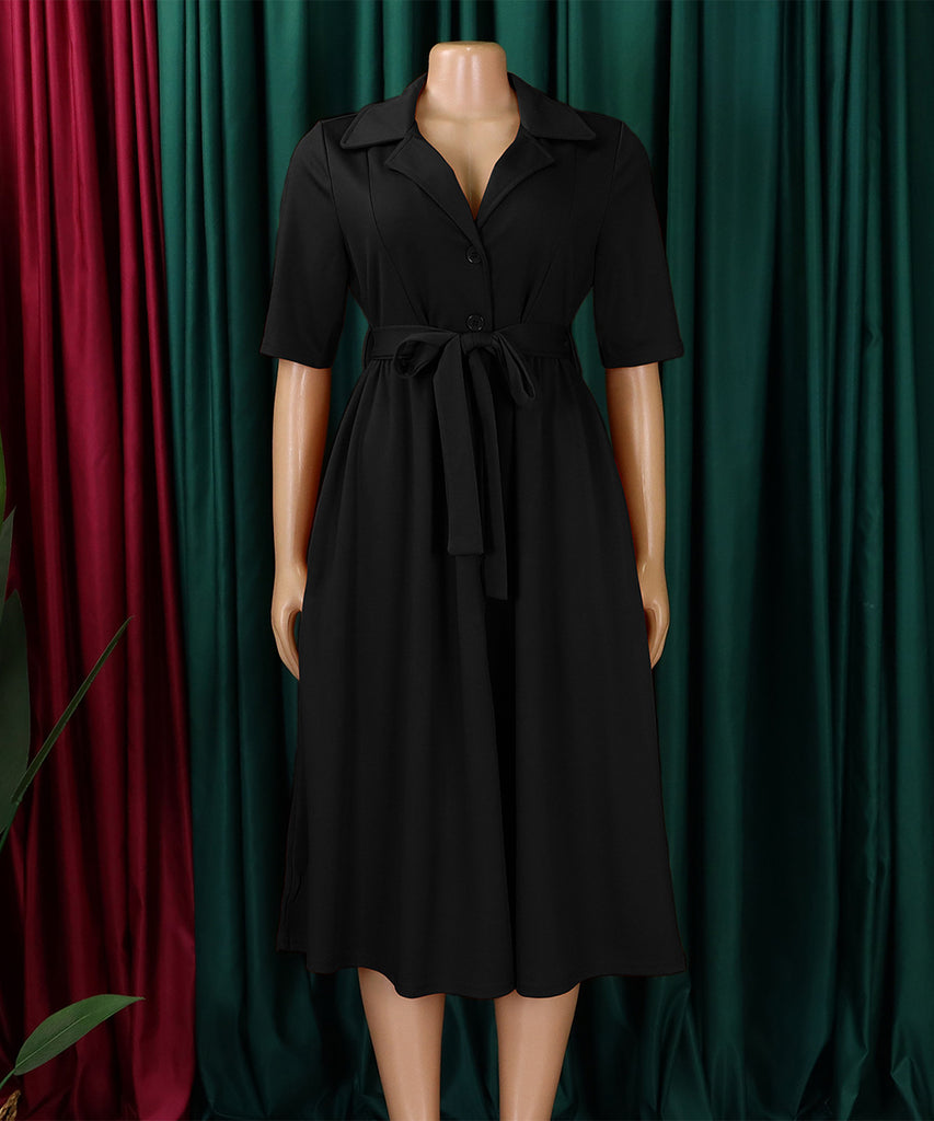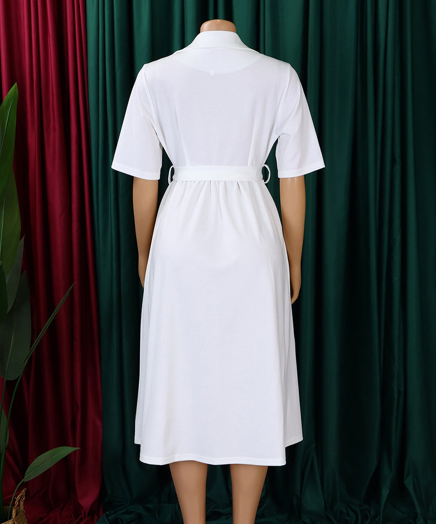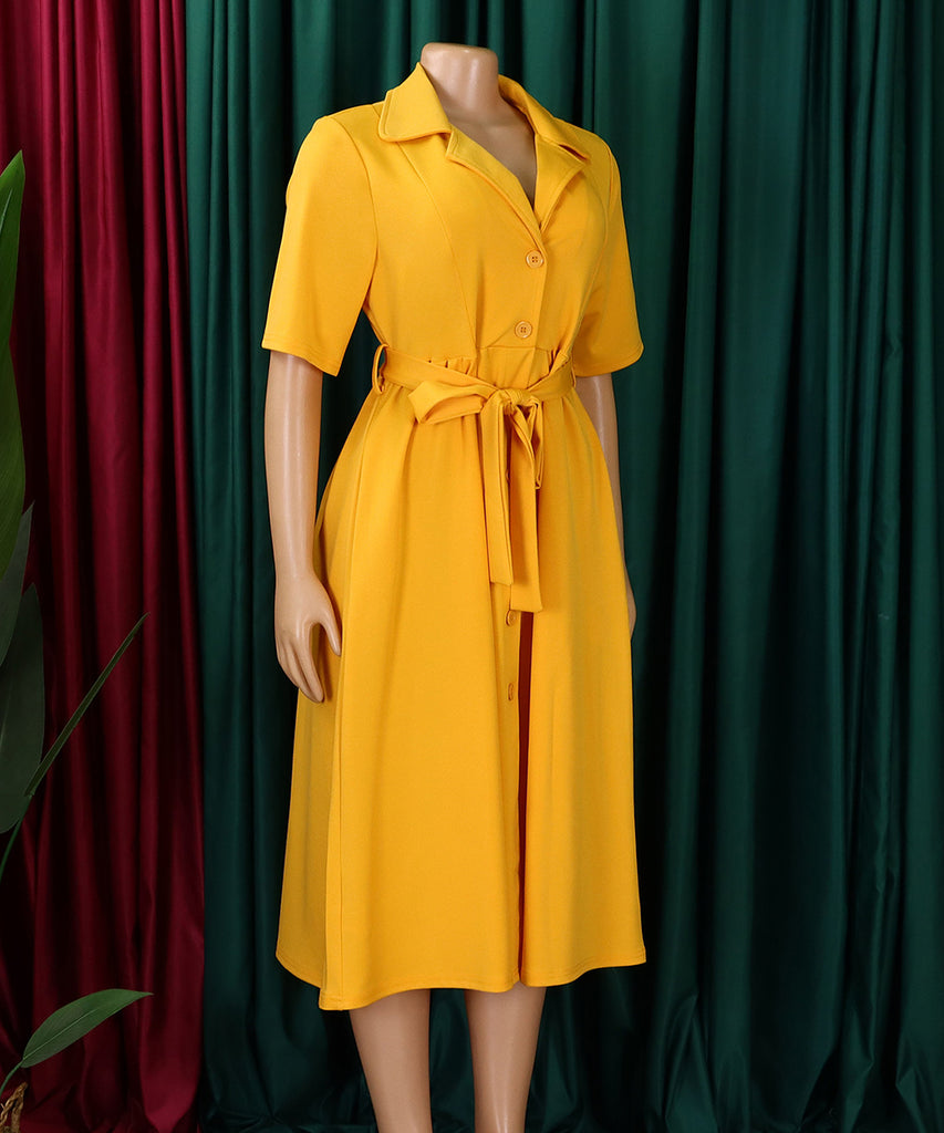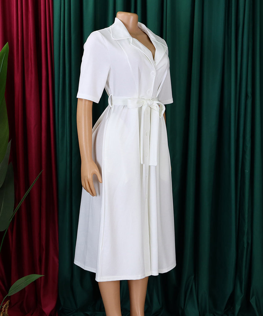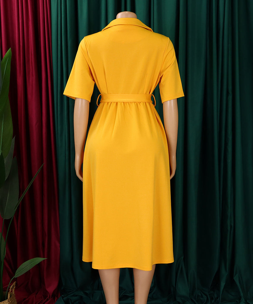 Short Sleeved Suit Style Collar Tie Dress in Solid Color with Belt