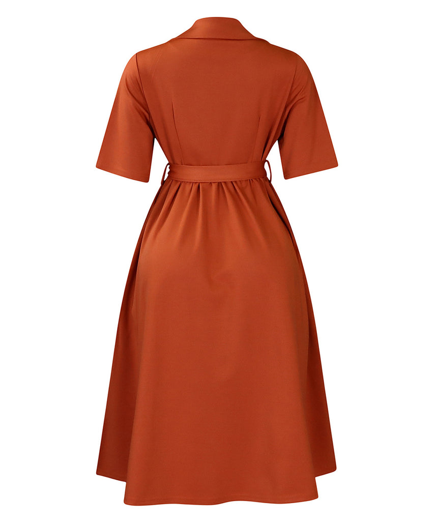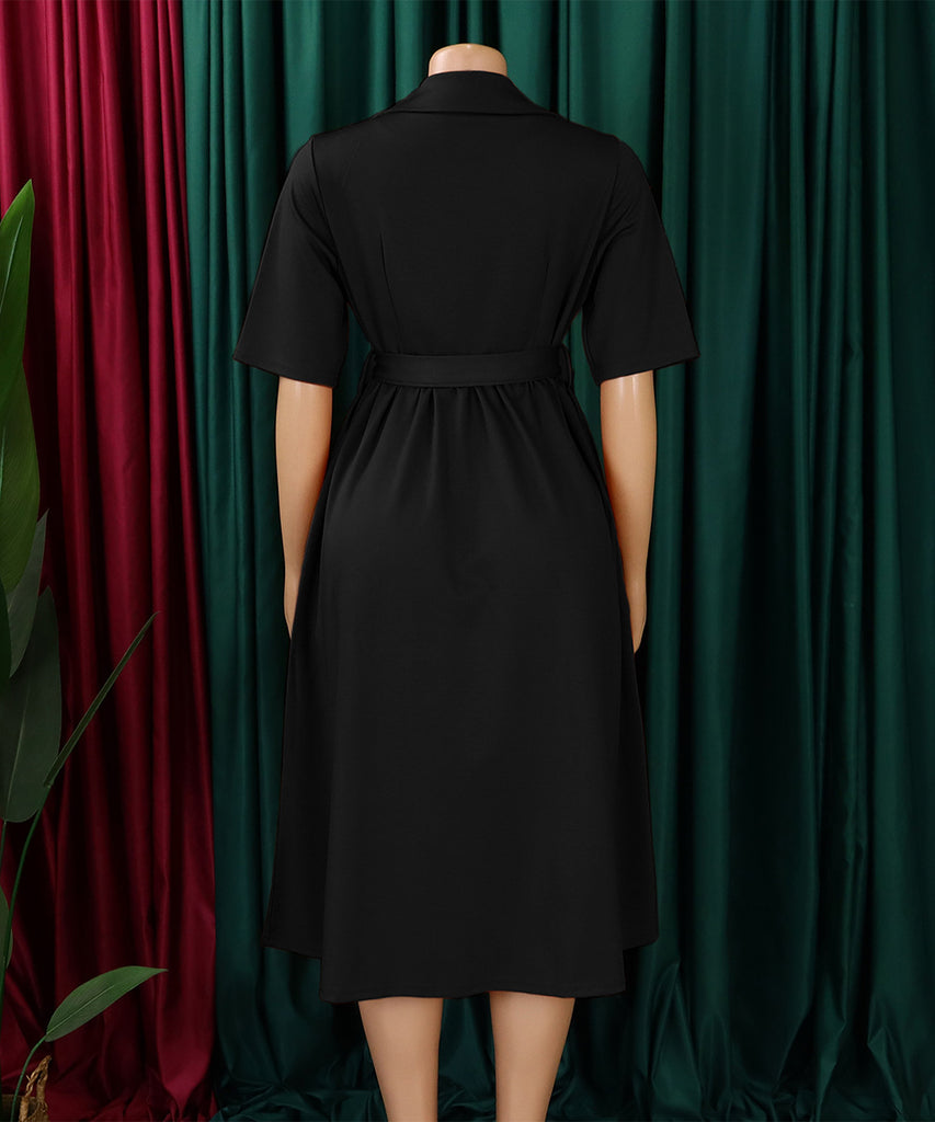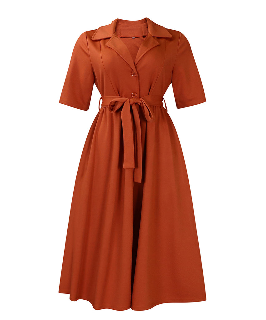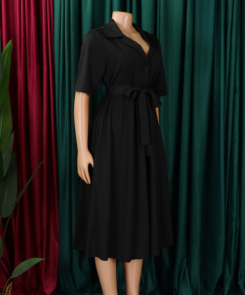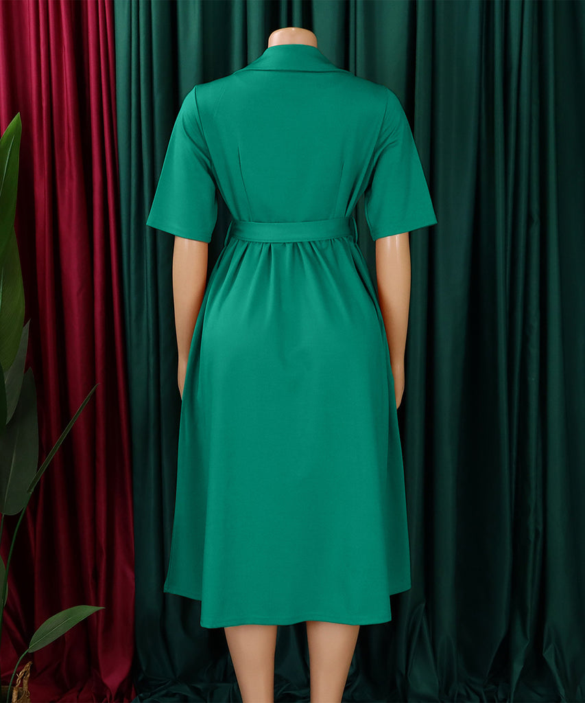 Short Sleeved Suit Style Collar Tie Dress in Solid Color with Belt