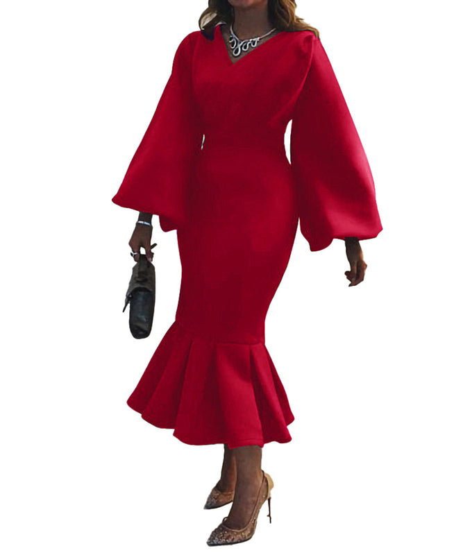 Discover the Elegance of Our Fashion Plus Size V-Neck Long Sleeve Sexy Fishtail Dress