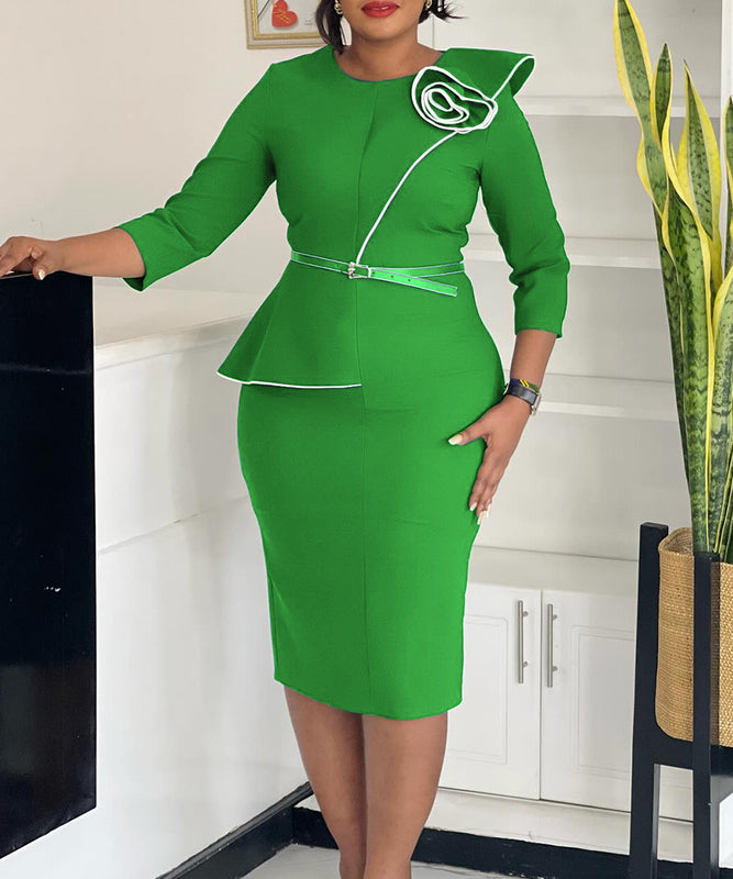 Elegant A-Line Pencil Skirt Dress With Belt in Deep Blue Green Rose Black
