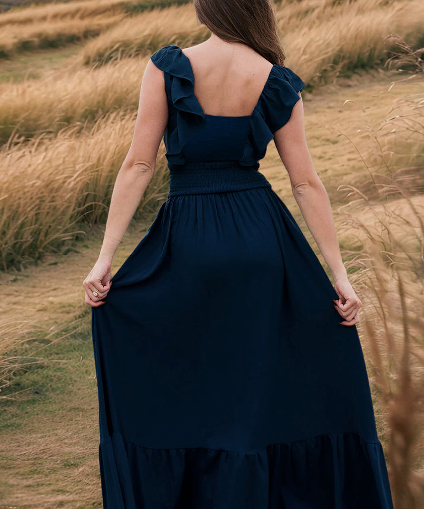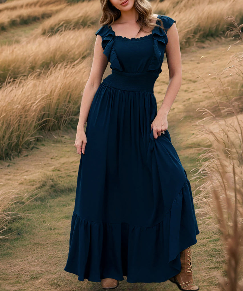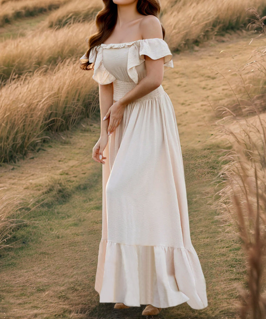 - Neckline & Details: Off-the-shoulder with ruffled-edge falbala
