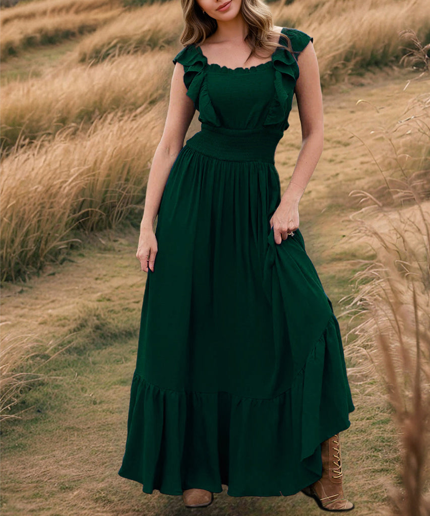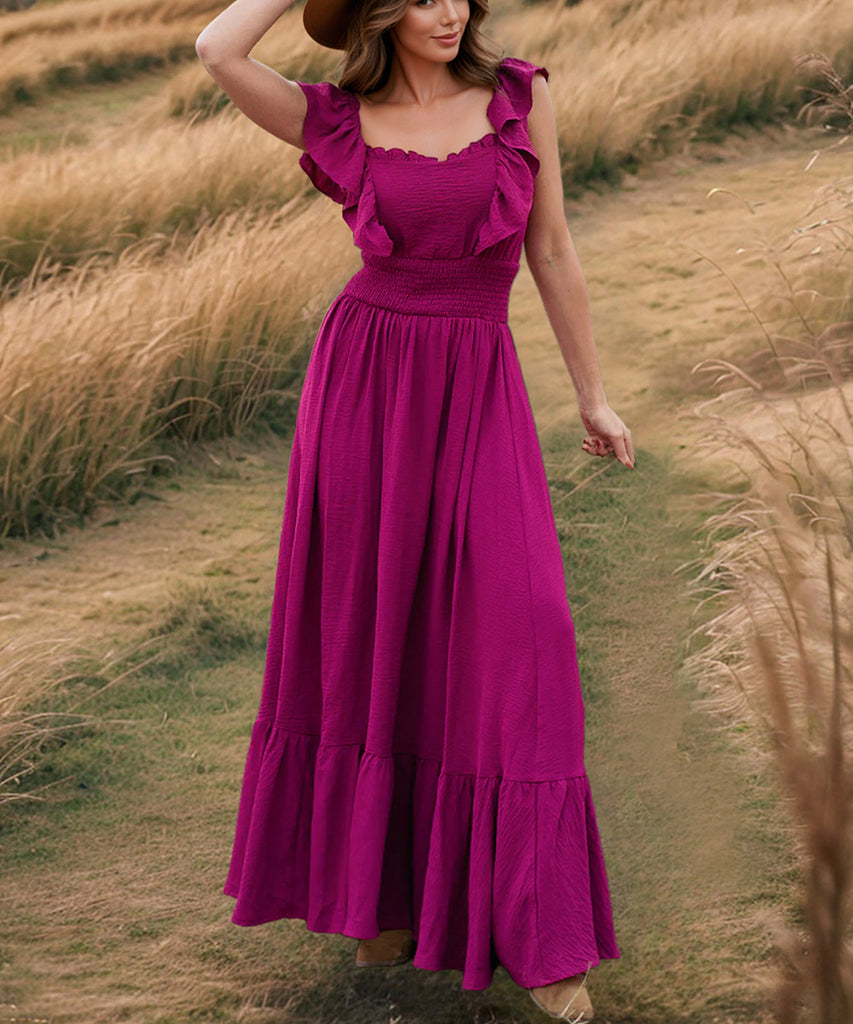 Elevate your event-ready lineup with the Ruffled-edge solid-color single-breasted off-the-shoulder dress. A sleek silhouette meets feminine detail for a look that wears well from day to night.
