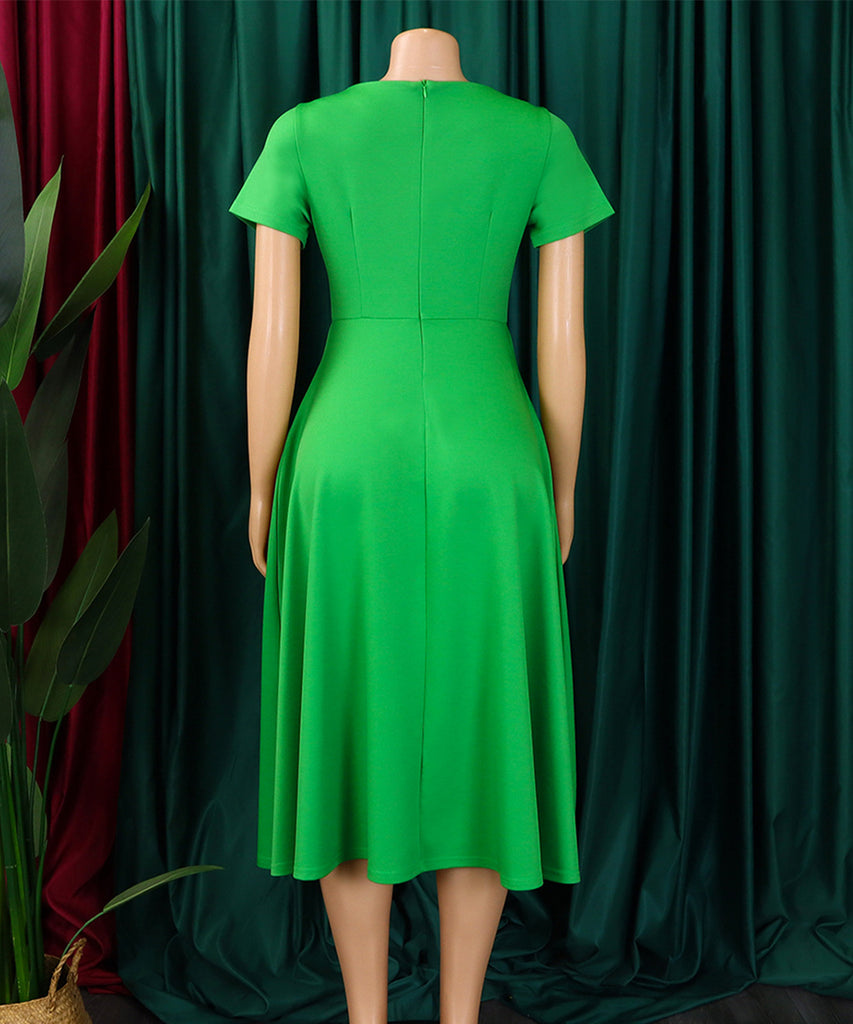 Fashionable Solid Color V Neck Short Sleeve A Line Dress