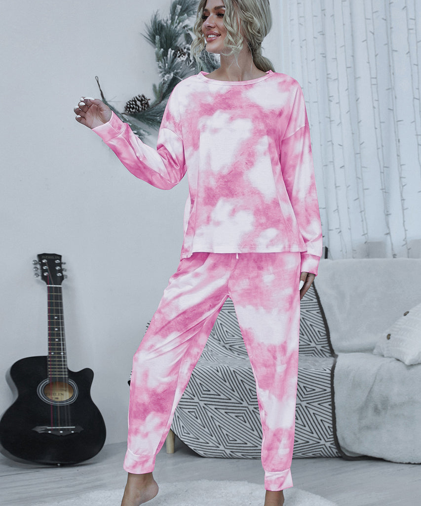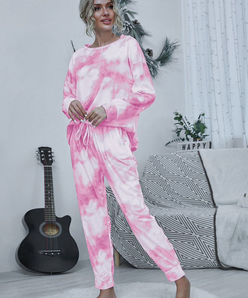 The enchanting pink tie-dye pattern adds a playful touch to your home attire, making it perfect for lounging around or casual outings. Its round neck and long sleeves provide a relaxed fit that flatters every body type, allowing you to enjoy both style and ease.
