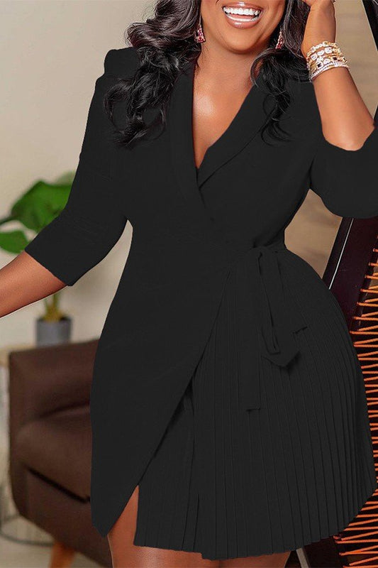 Chic Pleated Dress with Suit Collar and Adjustable Strap Waist