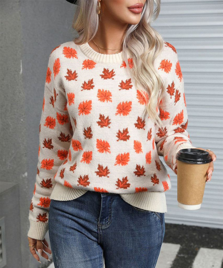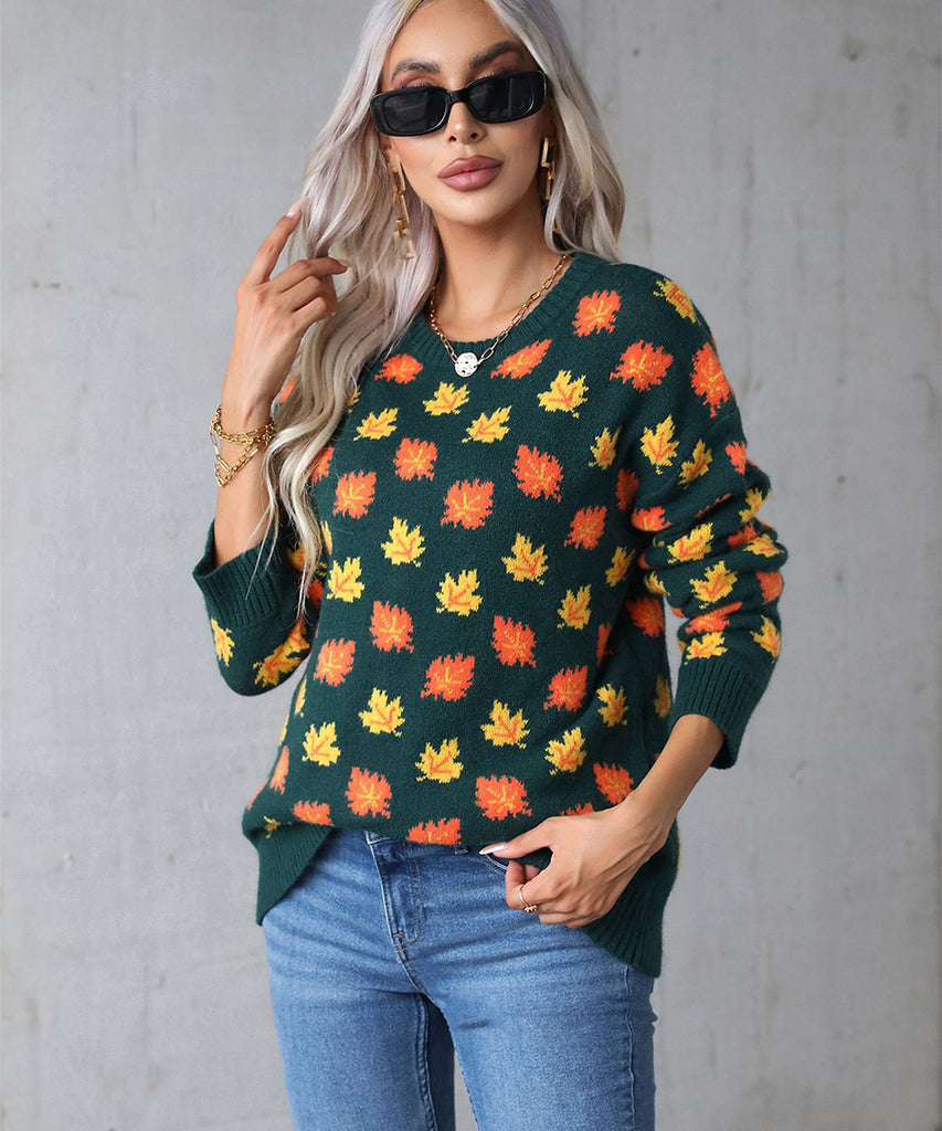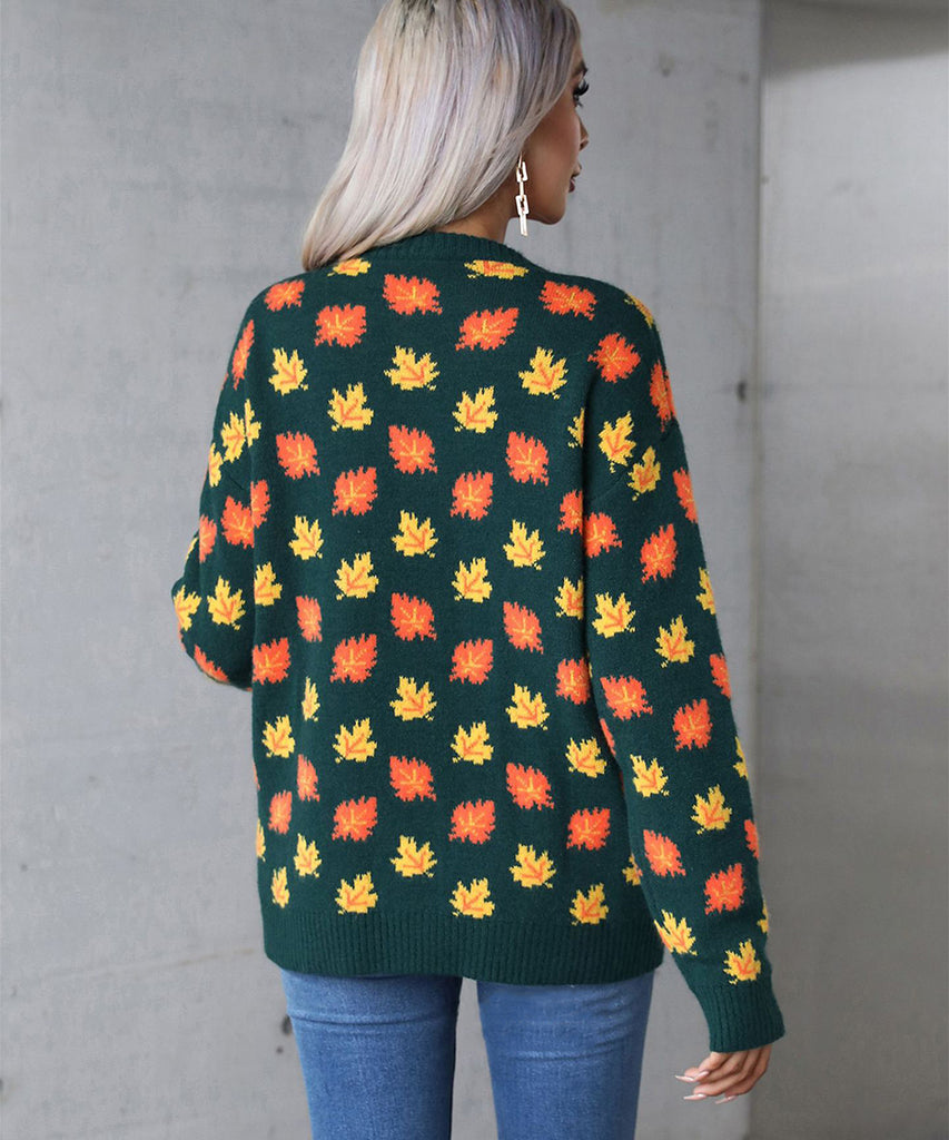 Classic Relaxed Womens Leafy Christmas Round Neck Sweater