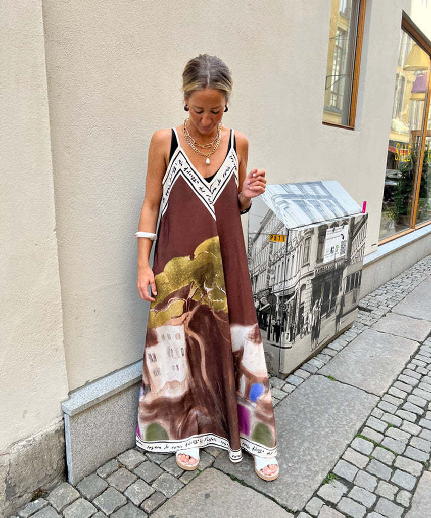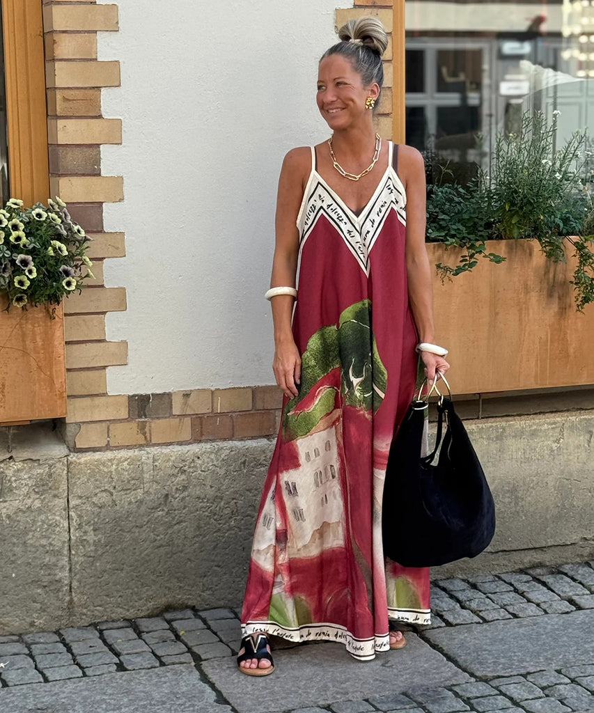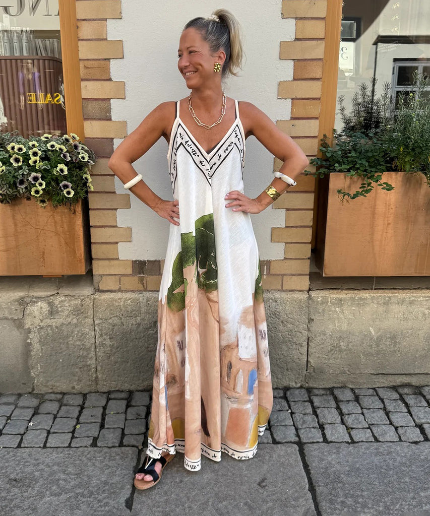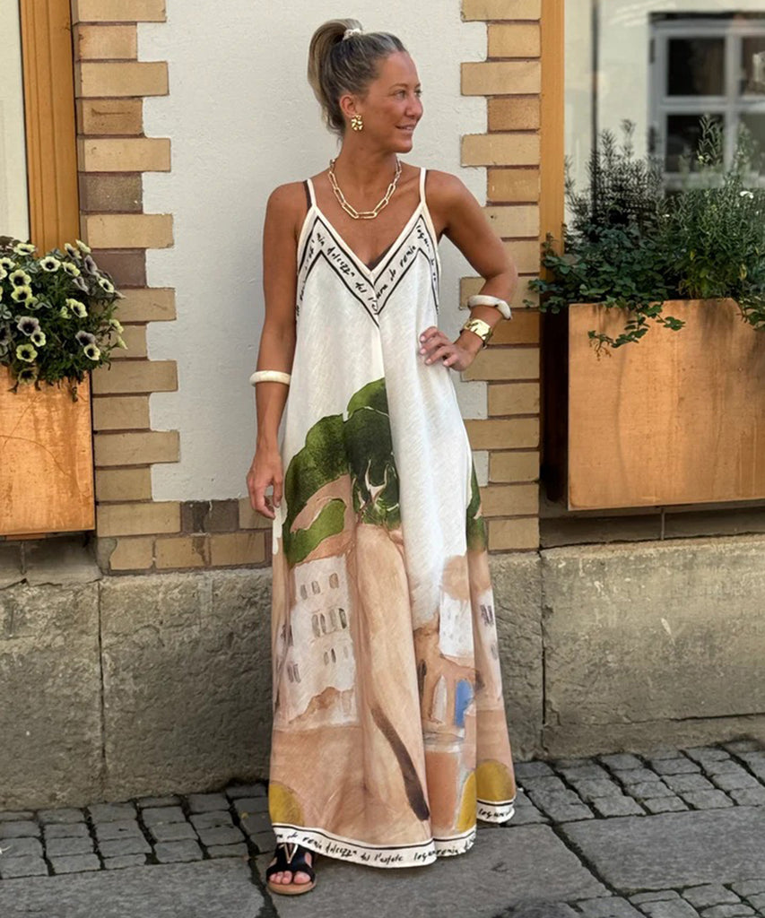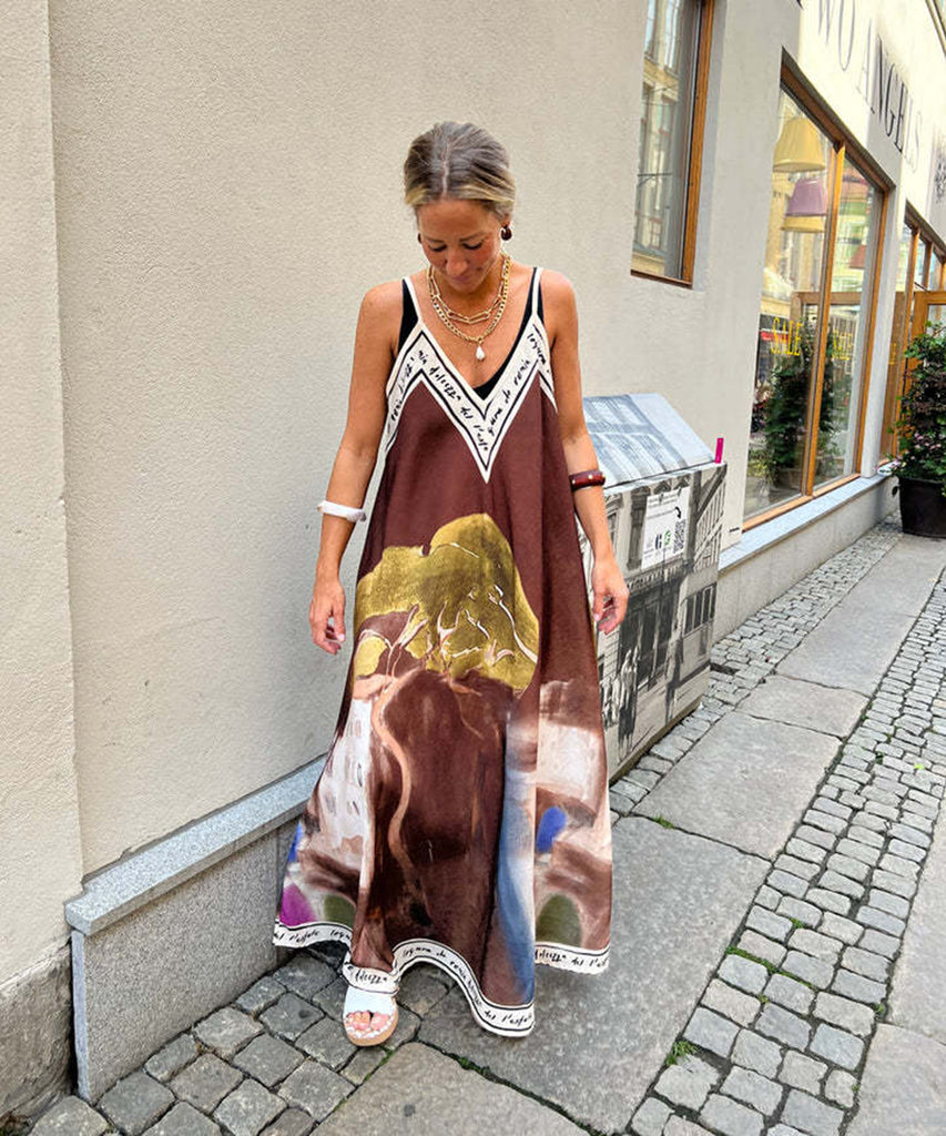 Relaxed Printed Vneck Strap Dress With Wide Skirt Style