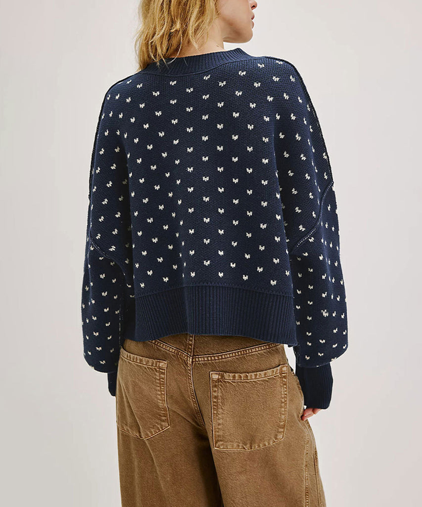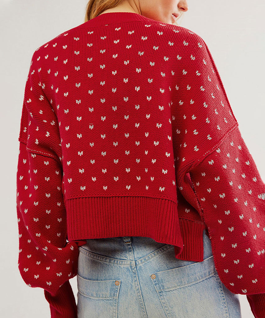 This round-neck knitted sweater is a short-style, loose-fit pullover in 100% acrylic, featuring a distinctive butterfly-shaped jacquard trim—available in white, red, khaki, and navy.