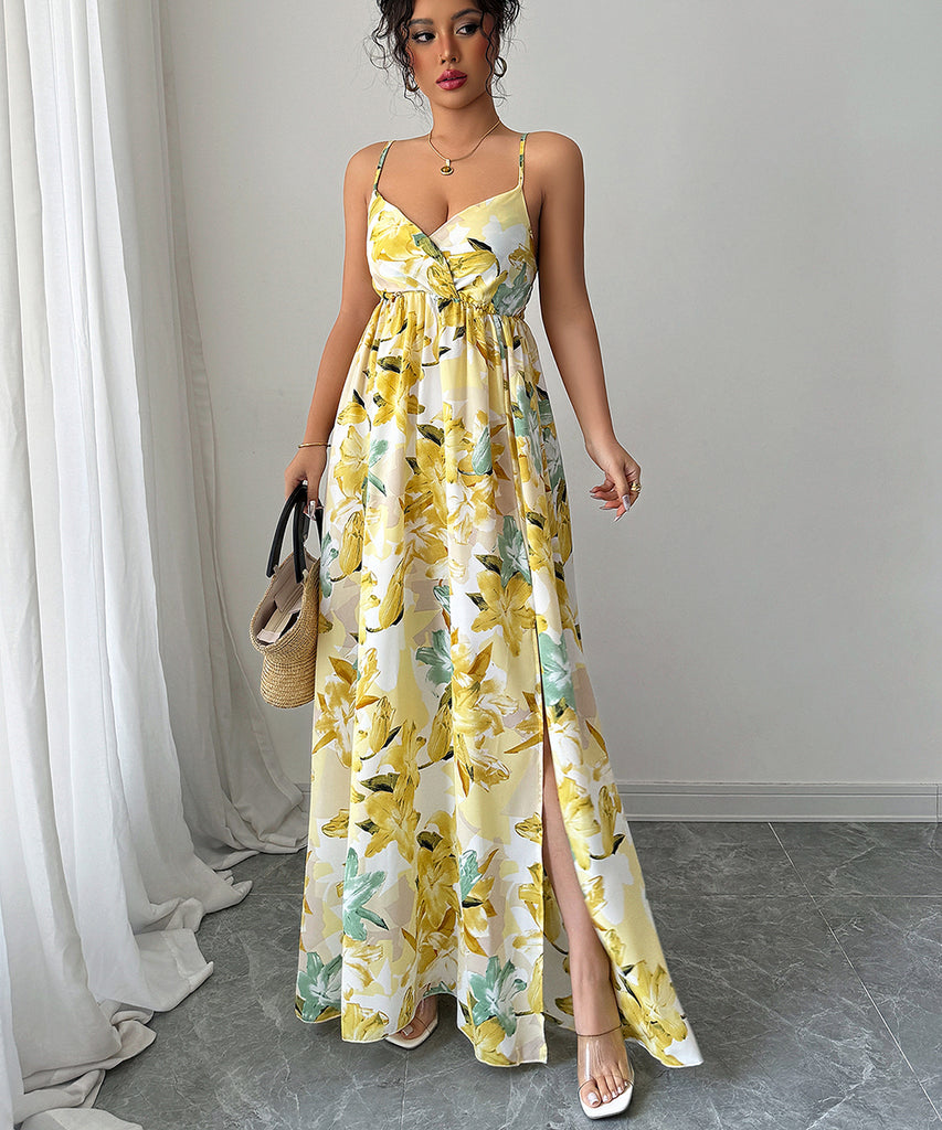 Elegant Flowy Printed Long Dress with Straps in Yellow
