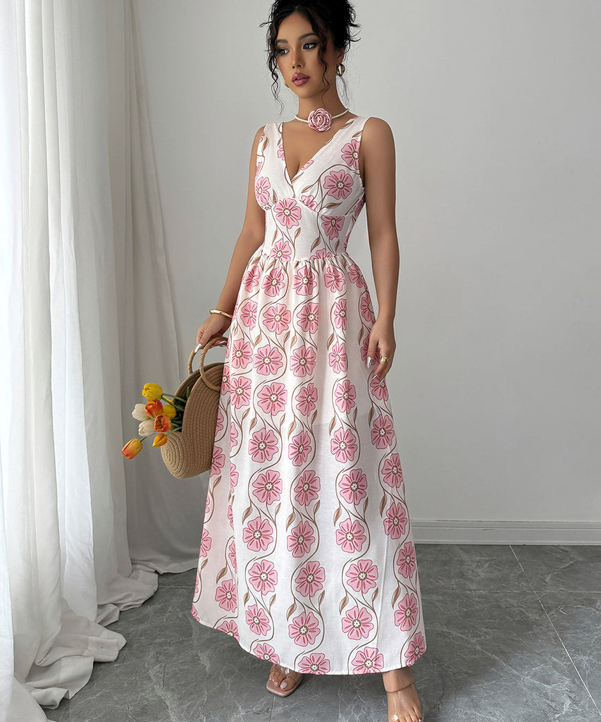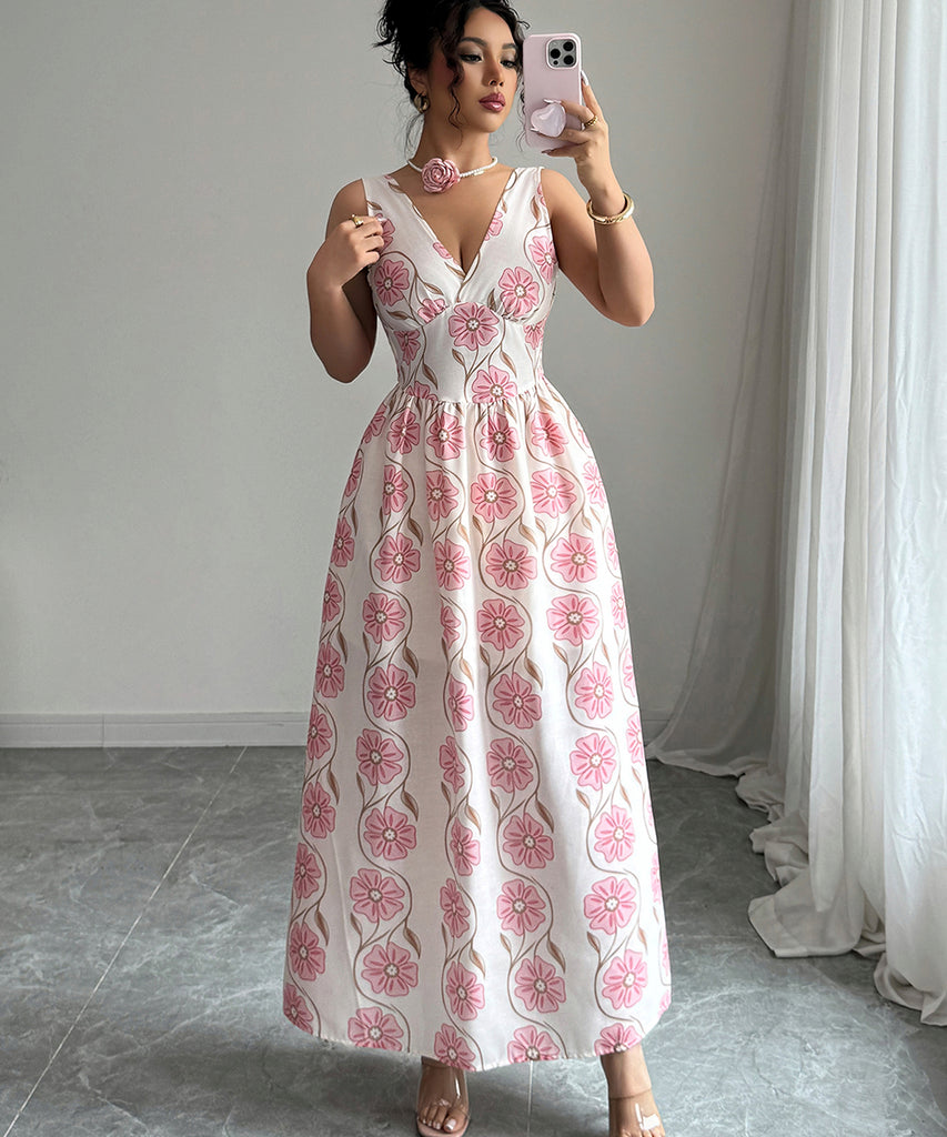The sleeveless design and flattering v-neck neckline beautifully accentuate your figure, while the girdling effect ensures a perfect fit that hugs your curves in all the right places. Whether you're attending a garden party, a wedding, or a romantic dinner, this dress will have you turning heads.