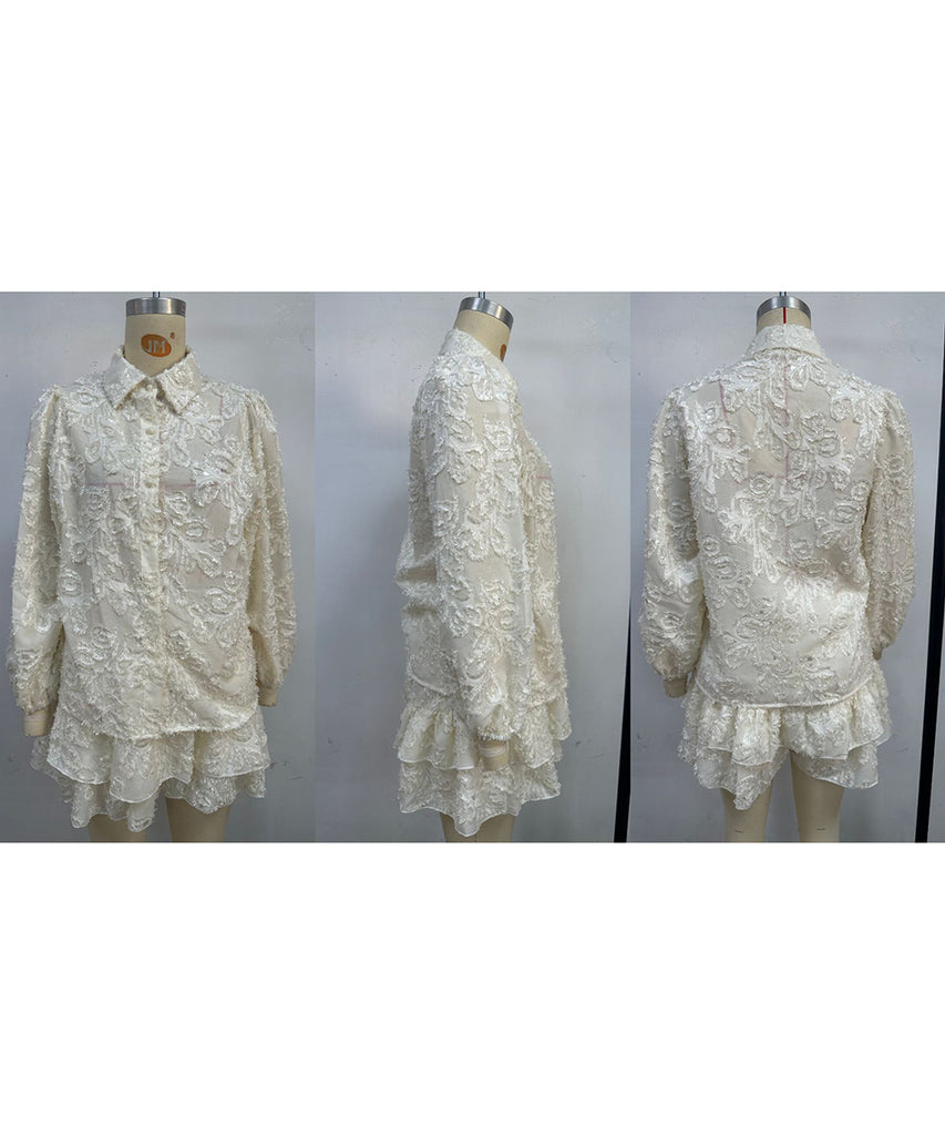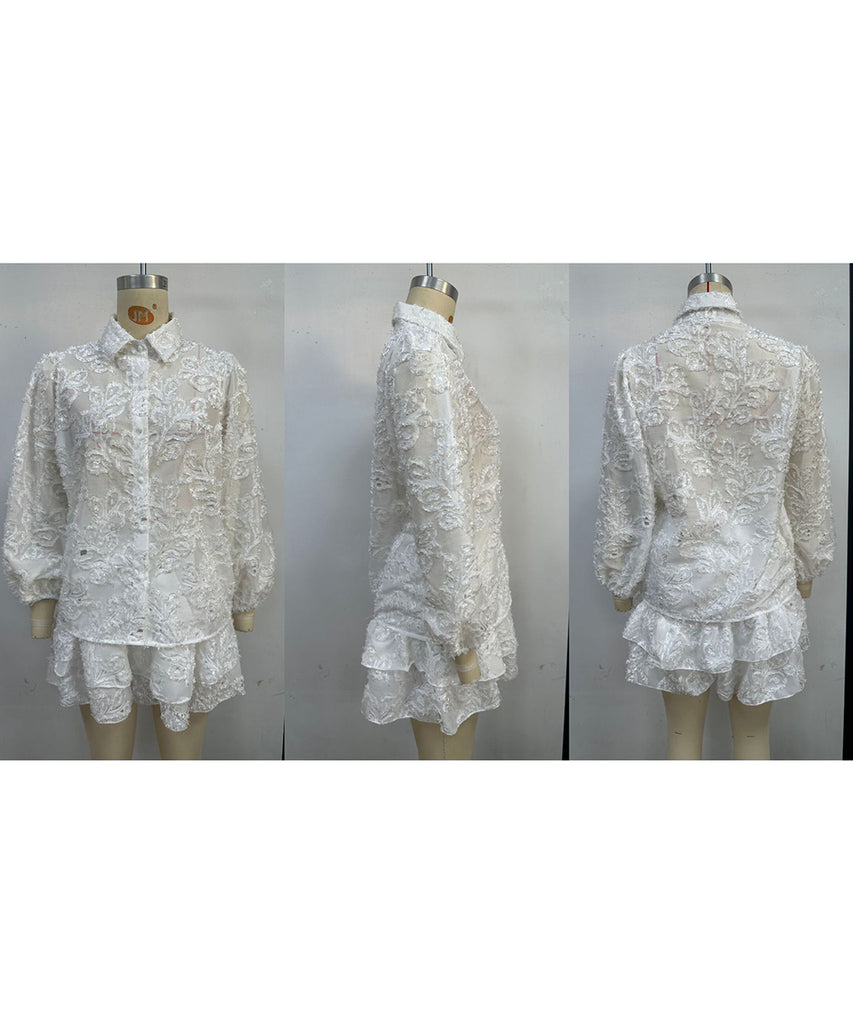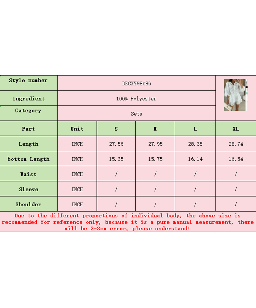Elevate your casual wardrobe with our Lace Cutout Casual Long-Sleeve Set. Crafted from 100% polyester, this stunning ensemble combines comfort and style effortlessly. The intricate lace detailing and hollow out design add a touch of elegance, making it a standout piece in the fashion apparel category. Available in chic colors—white, black, light green, and apricot—this set adapts to any occasion, whether you're heading to brunch or a night out.